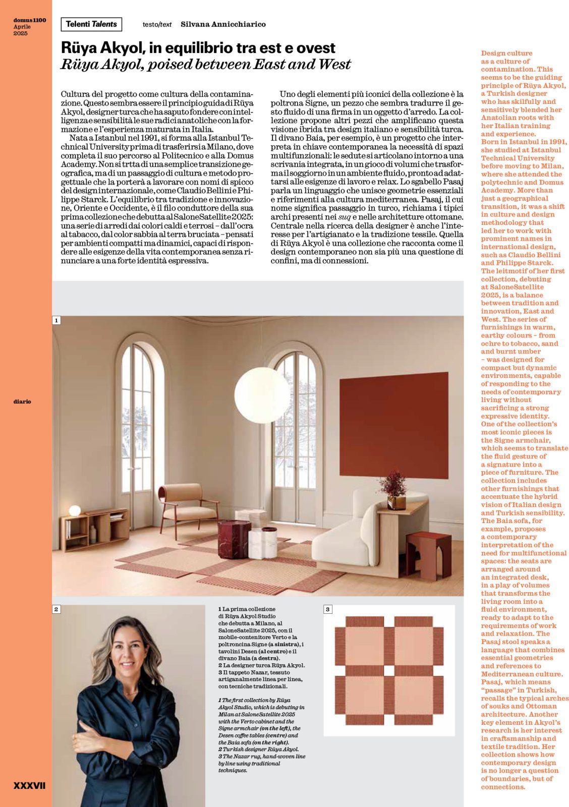Design culture as a culture of contamination. This seems to be the guiding principle of Rüya Akyol, a Turkish designer who has skilfully and sensitively blended her Anatolian roots with her Italian training and experience. Born in Istanbul in 1991, she studied at Istanbul Technical University before moving to Milan, where she attended the polytechnic and Domus Academy. More than just a geographical transition, it was a shift in culture and design methodology that led her to work with prominent names in international design, such as Claudio Bellini and Philippe Starck. The leitmotif of her first collection, debuting at SaloneSatellite 2025, is a balance between tradition and innovation, East and West. The series of furnishings in warm, earthy colours – from ochre to tobacco, sand and burnt umber – was designed for compact but dynamic environments, capable of responding to the needs of contemporary living without sacrificing a strong expressive identity. One of the collection’s most iconic pieces is the Signe armchair, which seems to translate the fluid gesture of a signature into a piece of furniture. The collection includes other furnishings that accentuate the hybrid vision of Italian design and Turkish sensibility. The Baia sofa, for example, proposes a contemporary interpretation of the need for multifunctional spaces: the seats are arranged around an integrated desk, in a play of volumes that transforms the living room into a fluid environment, ready to adapt to the requirements of work and relaxation. The Pasaj stool speaks a language that combines essential geometries and references to Mediterranean culture. Pasaj, which means “passage” in Turkish, recalls the typical arches of souks and Ottoman architecture. Another key element in Akyol’s research is her interest in craftsmanship and textile tradition. Her collection shows how contemporary design is no longer a question of boundaries, but of connections.