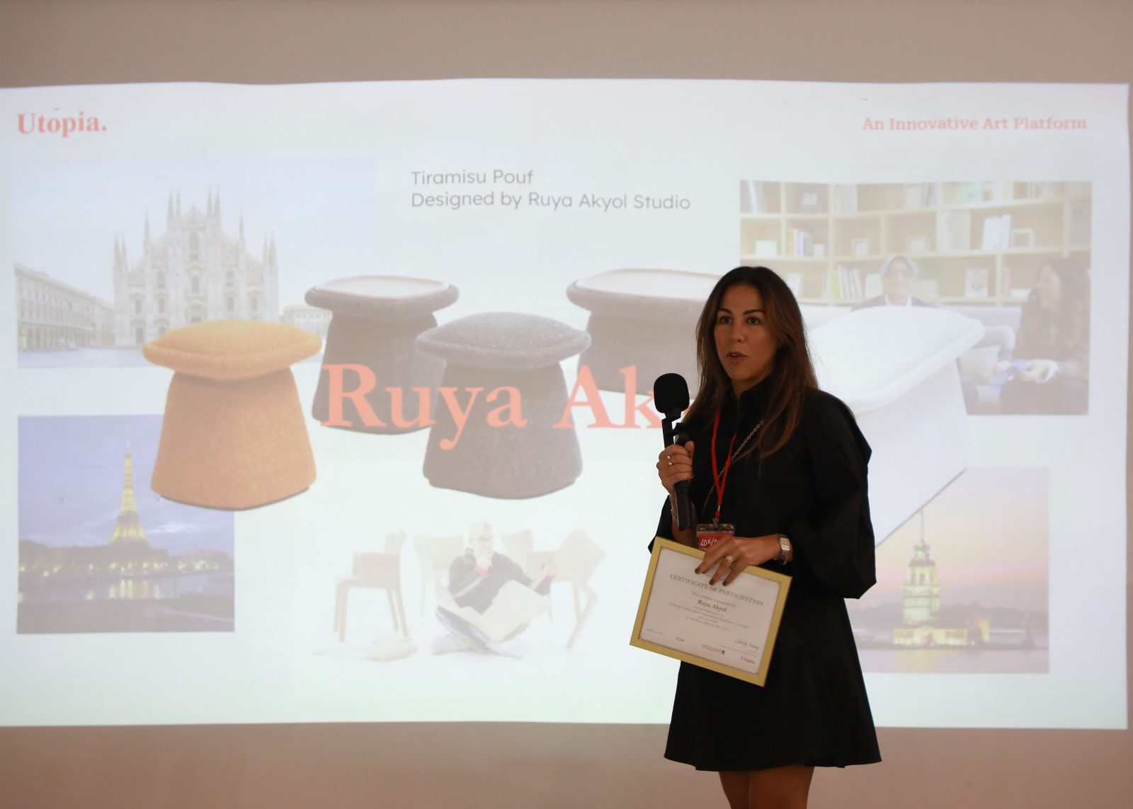 The Tiramisu Pouf, designed by Ruya Akyol Studio, was showcased at The Blanc Gallery in NYC in October as part of the Utopia exhibition. This prestigious event brought together 40 award-winning designers from around the globe who had received the esteemed A’ Design Award. Alongside the presentation of the Tiramisu Pouf, Ruya Akyol had the honor of joining a panel discussion with renowned design experts, sharing insights and experiences within the creative industry.