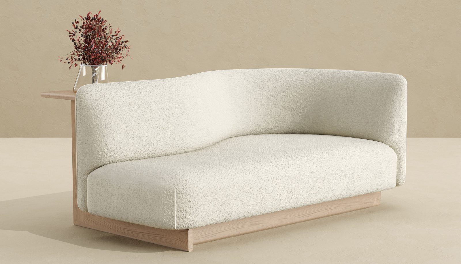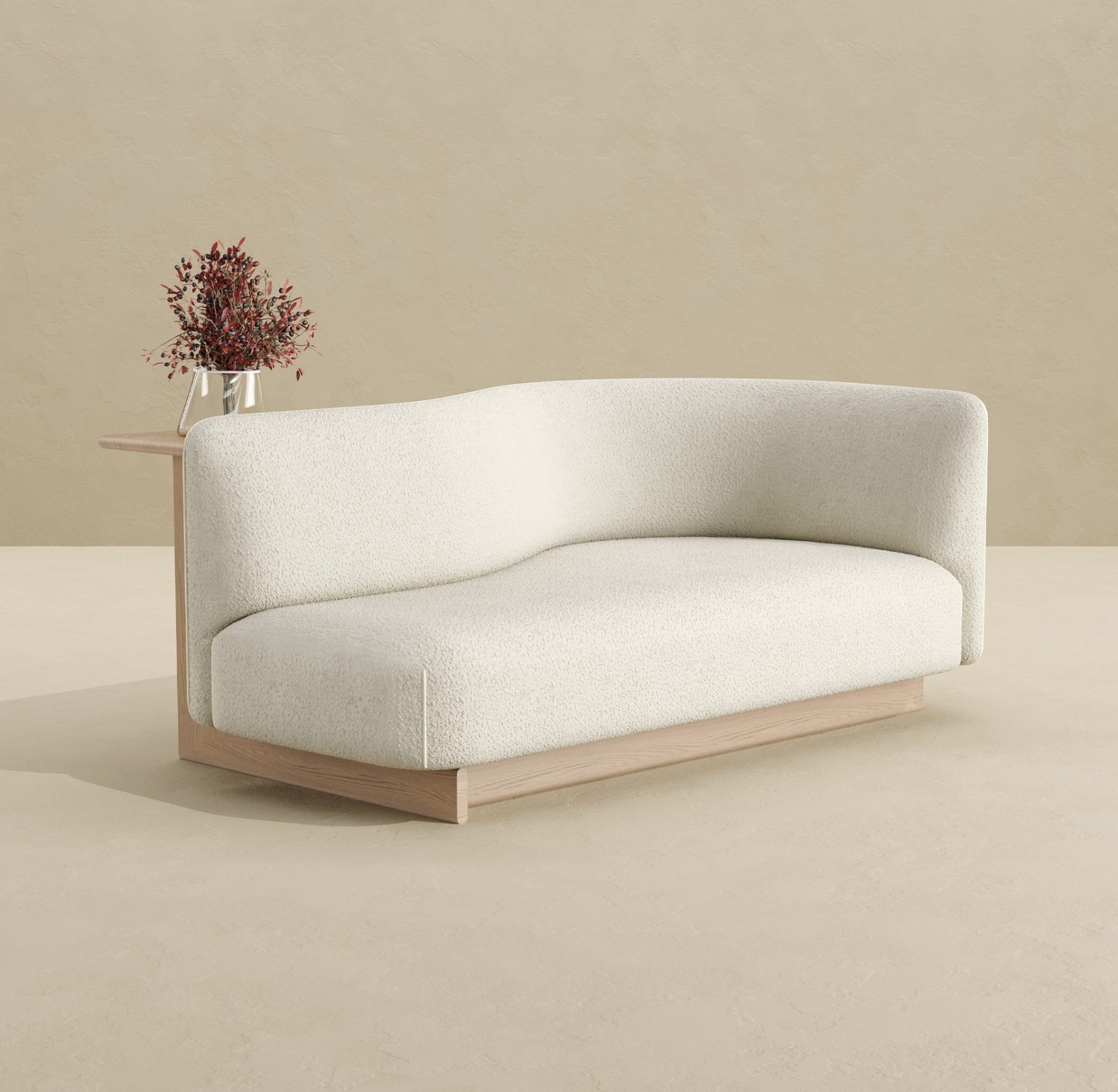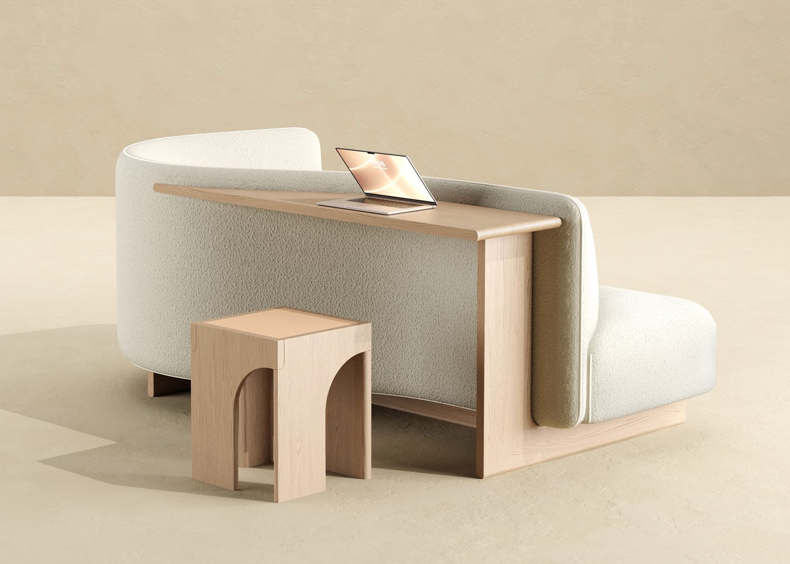 The curved silhouette supports a variety of seating positions – whether curled up, lounging, or reclining – while making a bold visual statement, and its built-in surface functions as a home-office desk, side table, and display shelf, enhancing both practicality and aesthetic appeal.