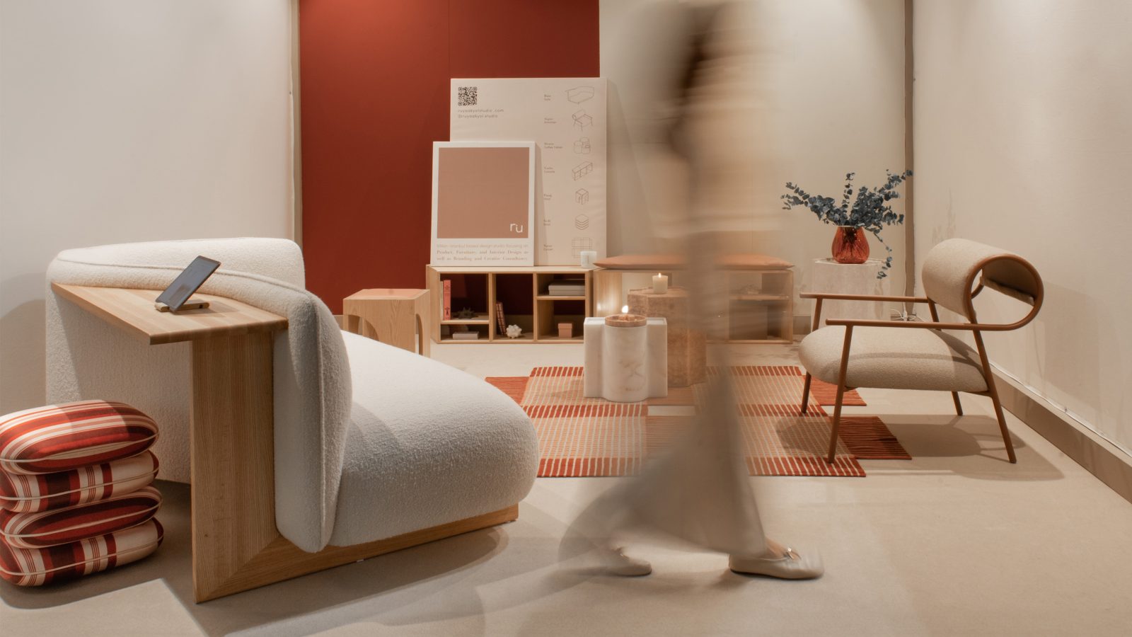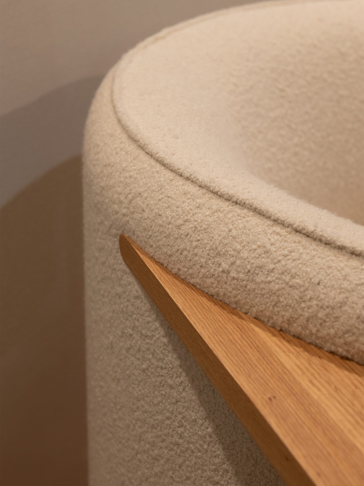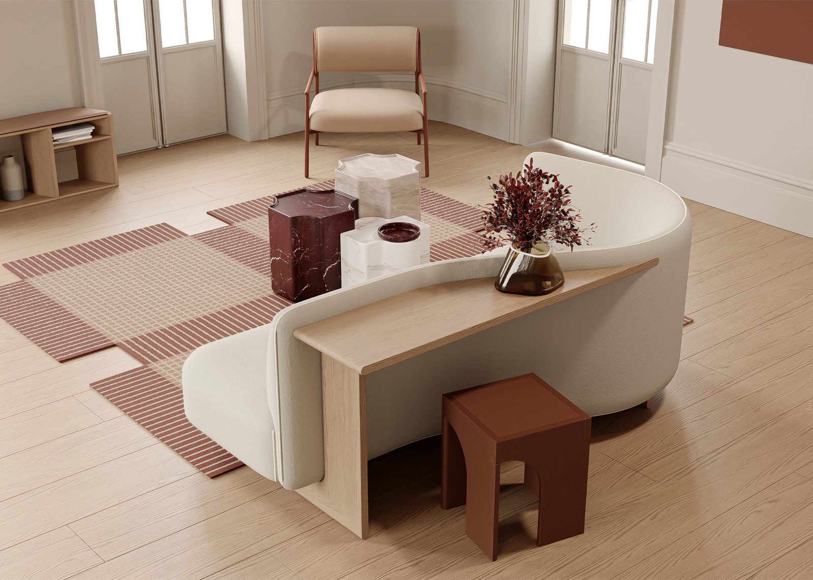 The curved silhouette supports a variety of seating positions – whether curled up, lounging, or reclining – while making a bold visual statement, and its built-in surface functions as a home-office desk, side table, and display shelf, enhancing both practicality and aesthetic appeal.