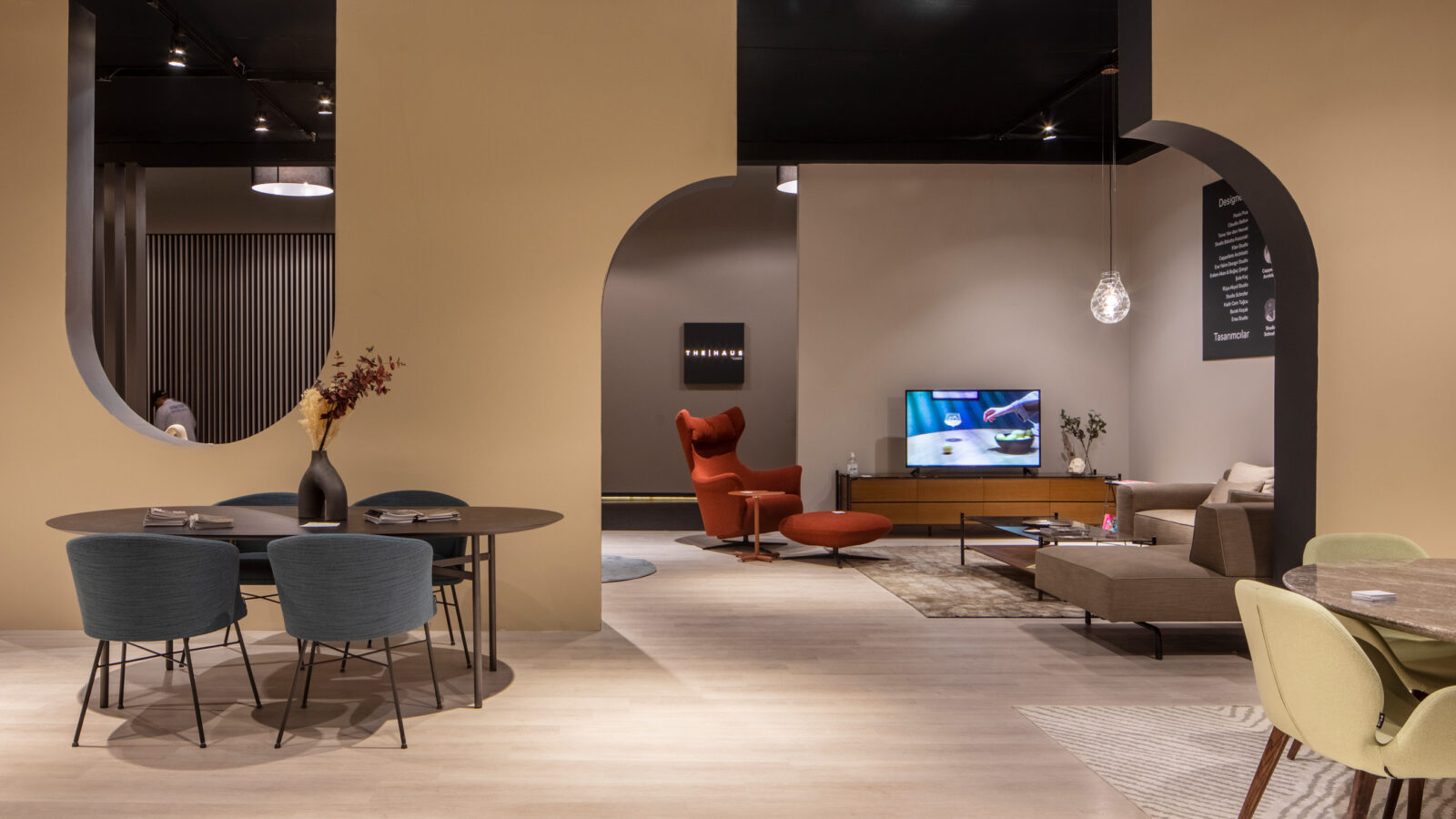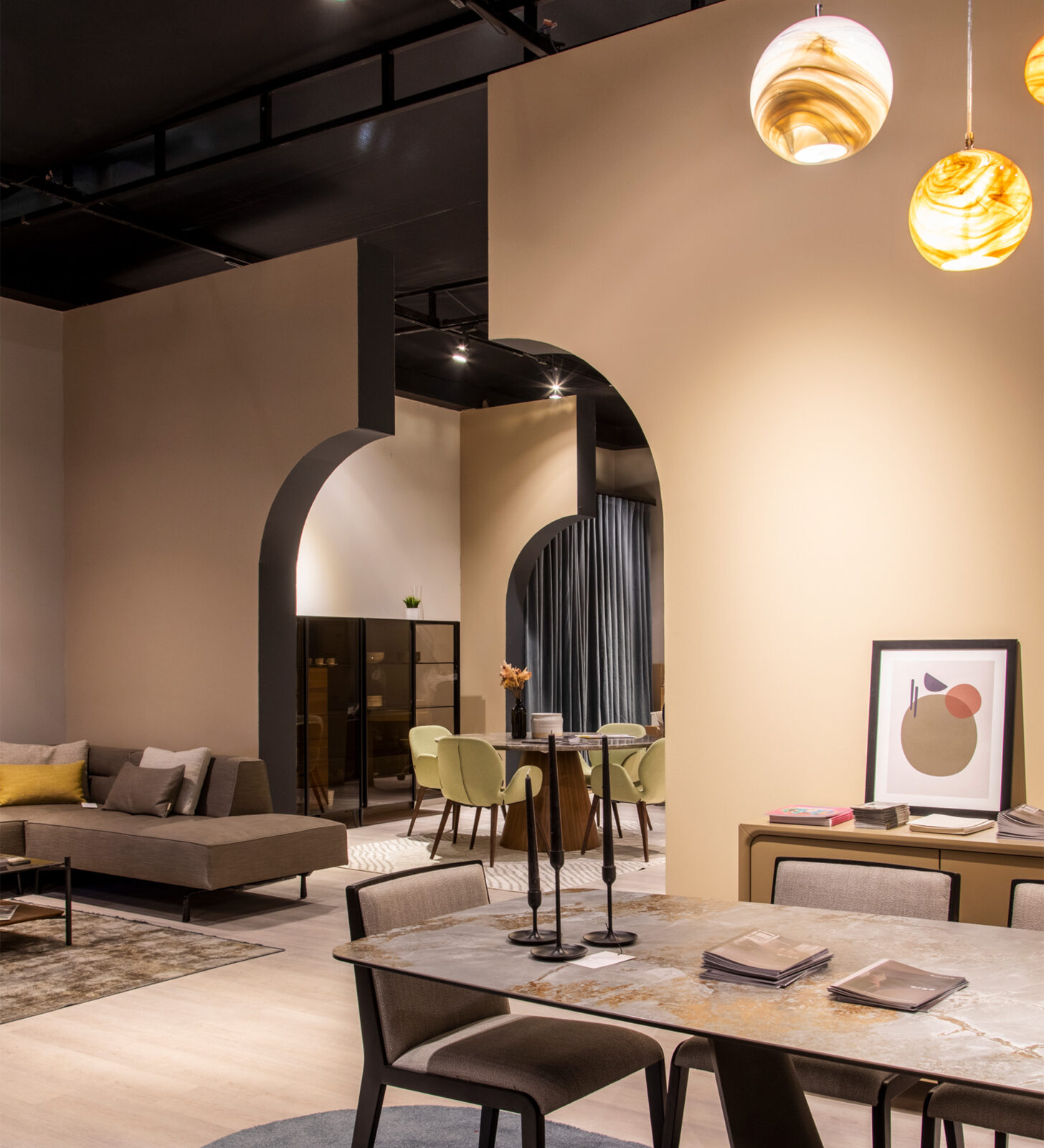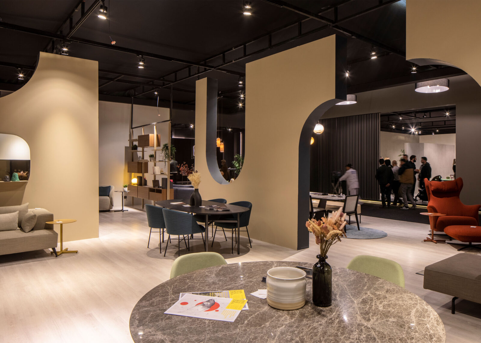 The booth design allows the visitor to experience a fluid transition between the rooms while giving a hint about the next room from the small windows and cuts that have been created by the characteristic separation elements. The color scheme of the booth is natural to highlight the products and materials.