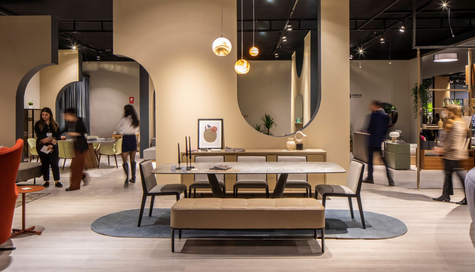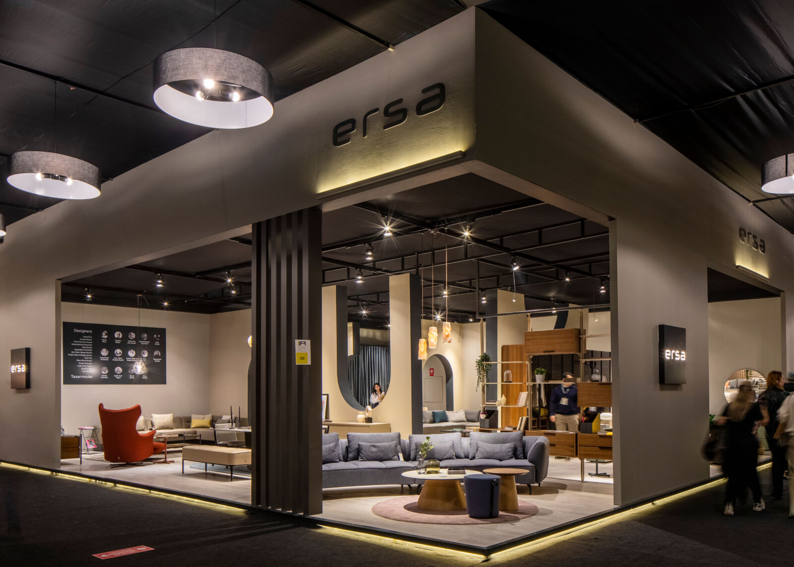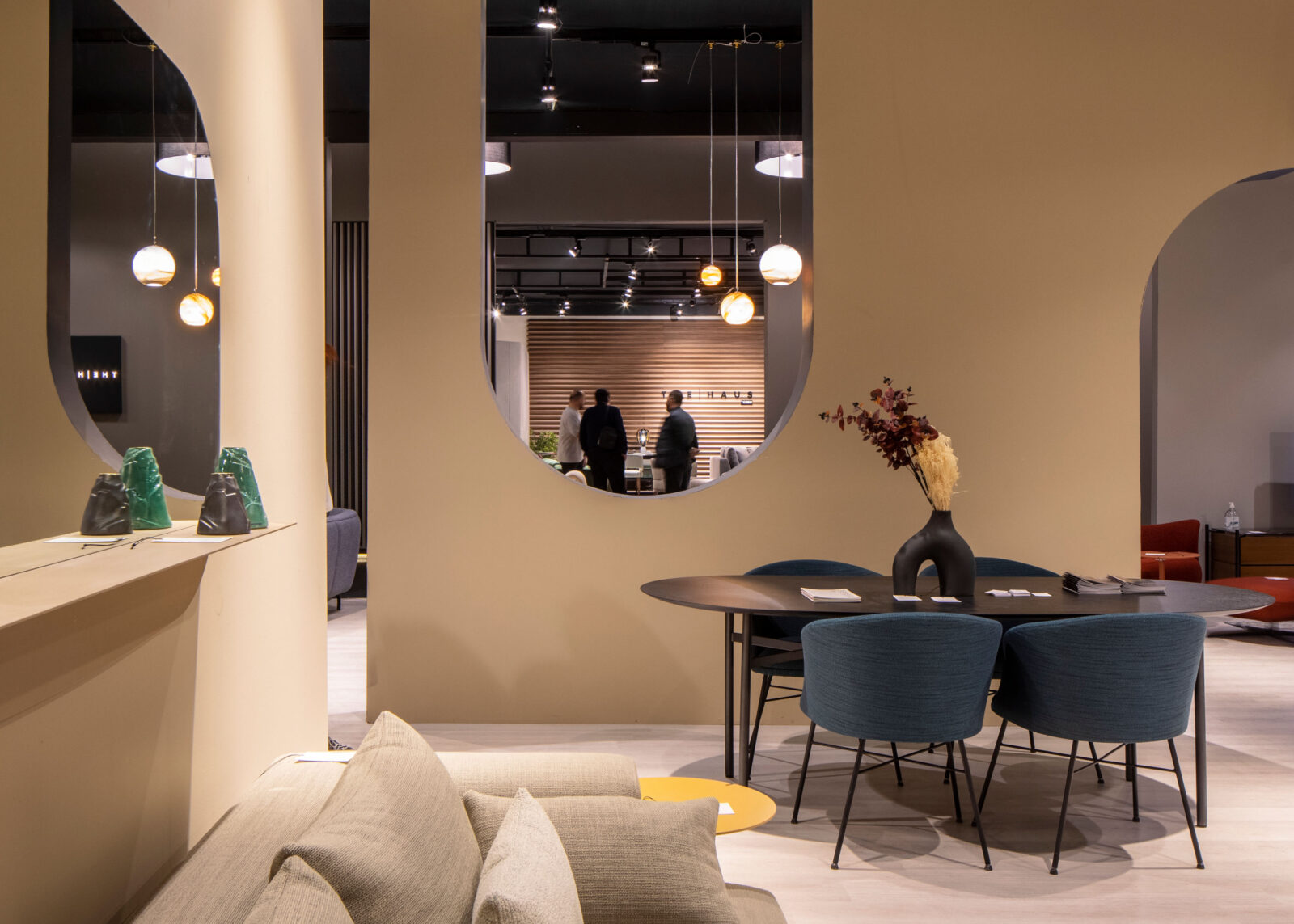 The booth design allows the visitor to experience a fluid transition between the rooms while giving a hint about the next room from the small windows and cuts that have been created by the characteristic separation elements. The color scheme of the booth is natural to highlight the products and materials.