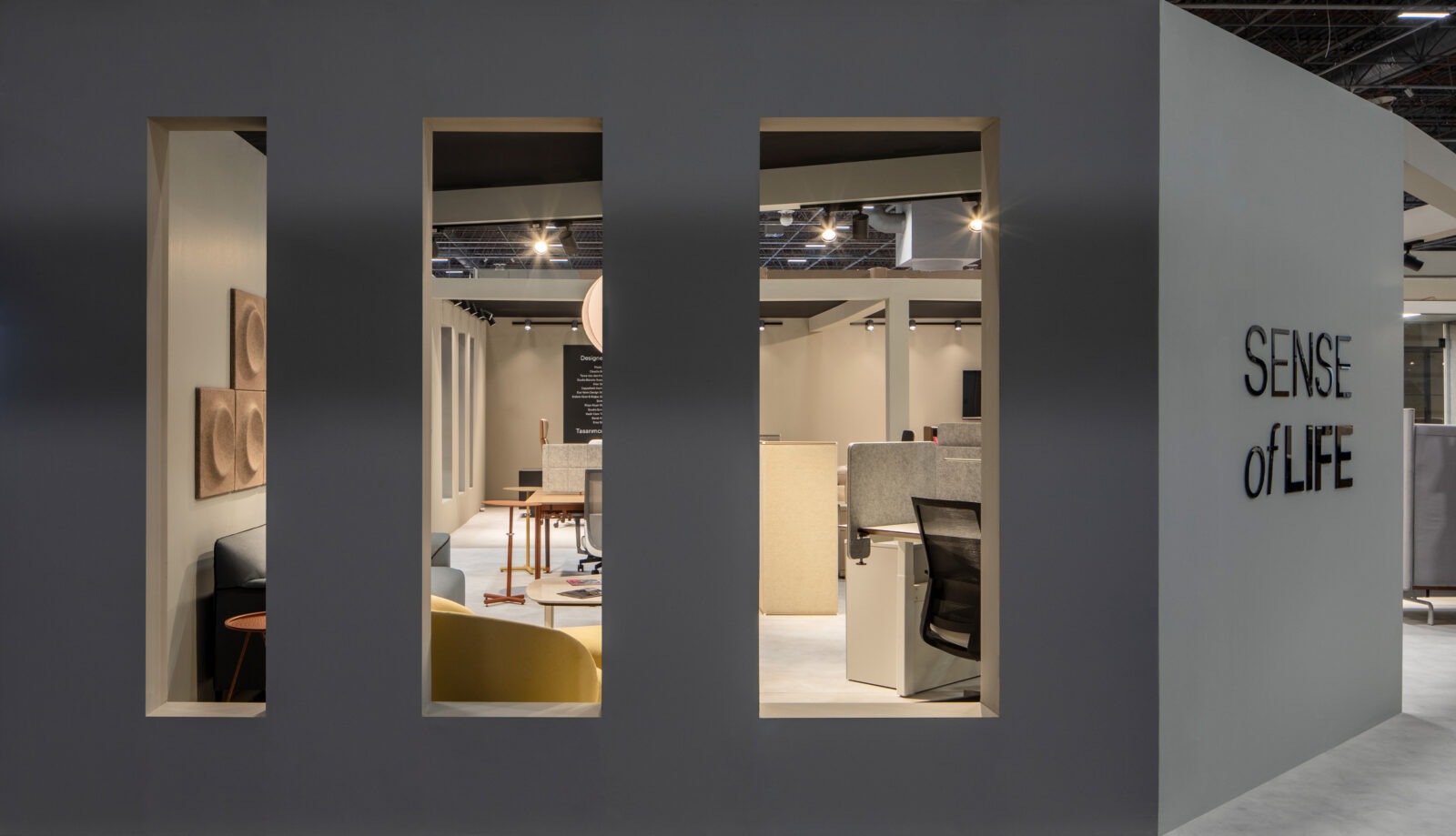Observing the interaction of the people with the space the booth has been redesigned, creating an important entrance and divided spaces. The rooms can be observed from outside thanks to the geometrical windows, giving a glimpse of the atmosphere.