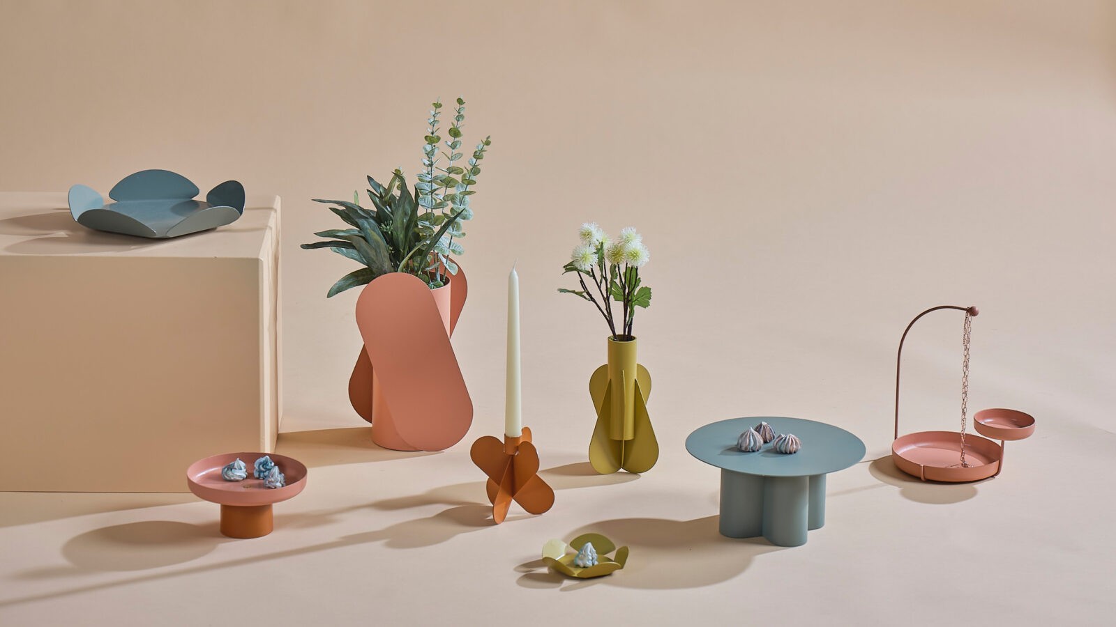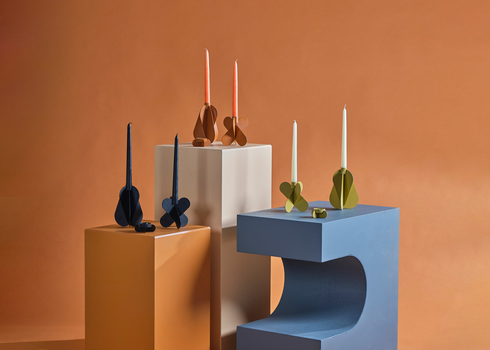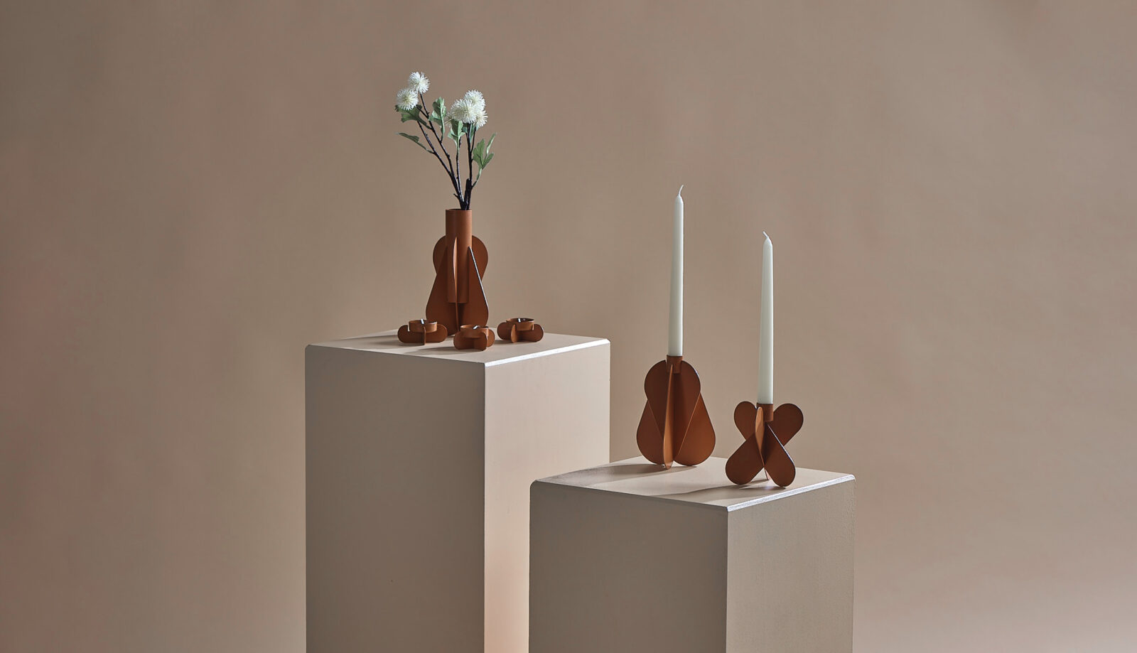 The candle holder family arises from the combination of the pieces cut using the simplest production techniques to form a three-dimensional object. The contours of the parts that make up the products with this name, which comes from the combination of the words Floral and Real, are congruent ellipses.