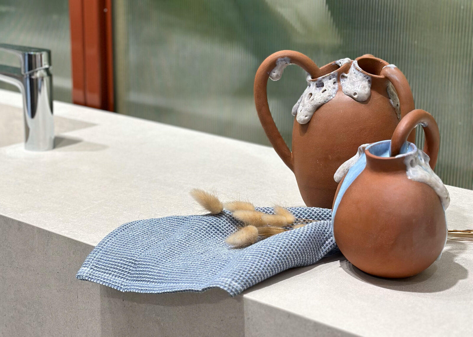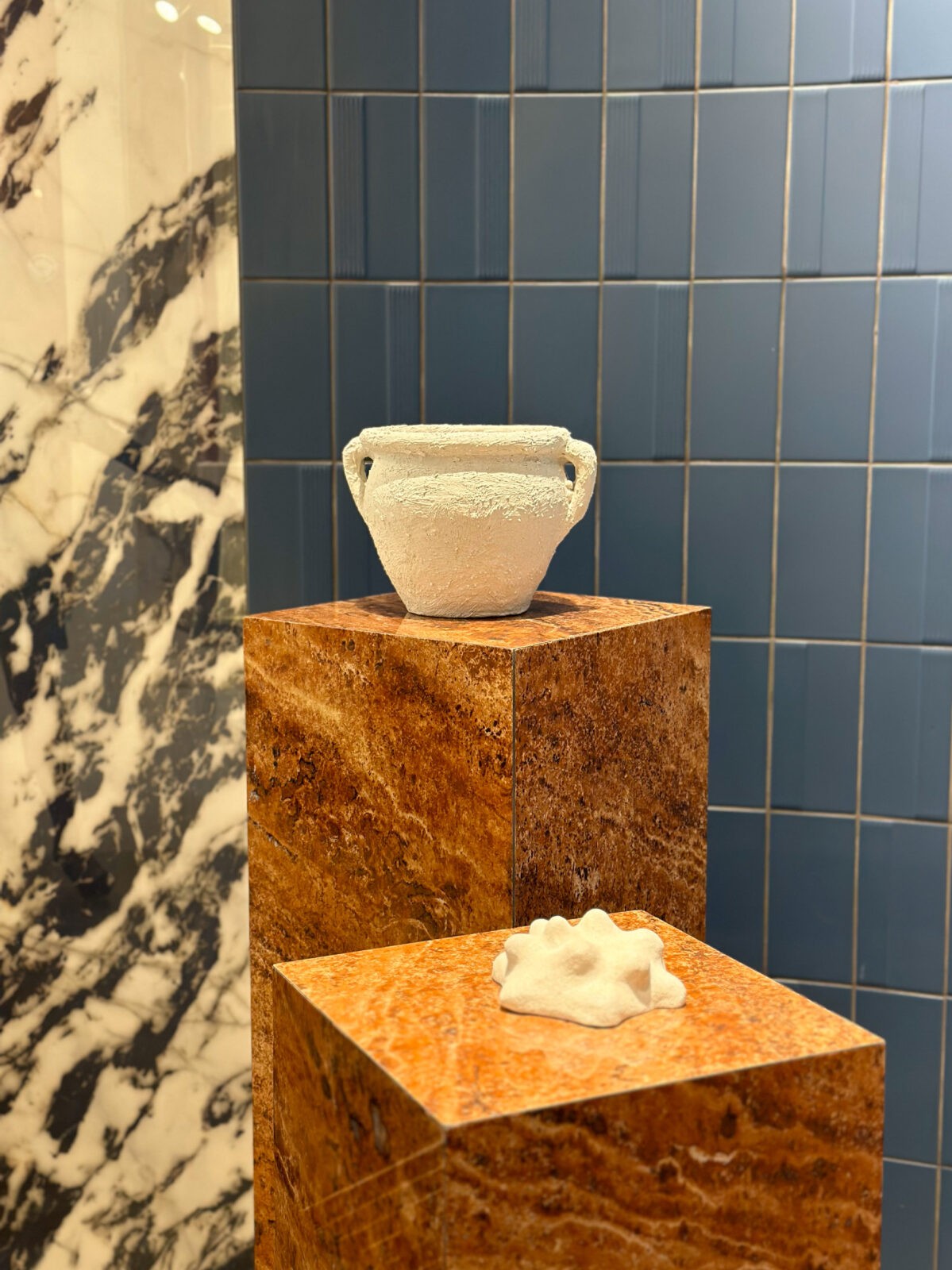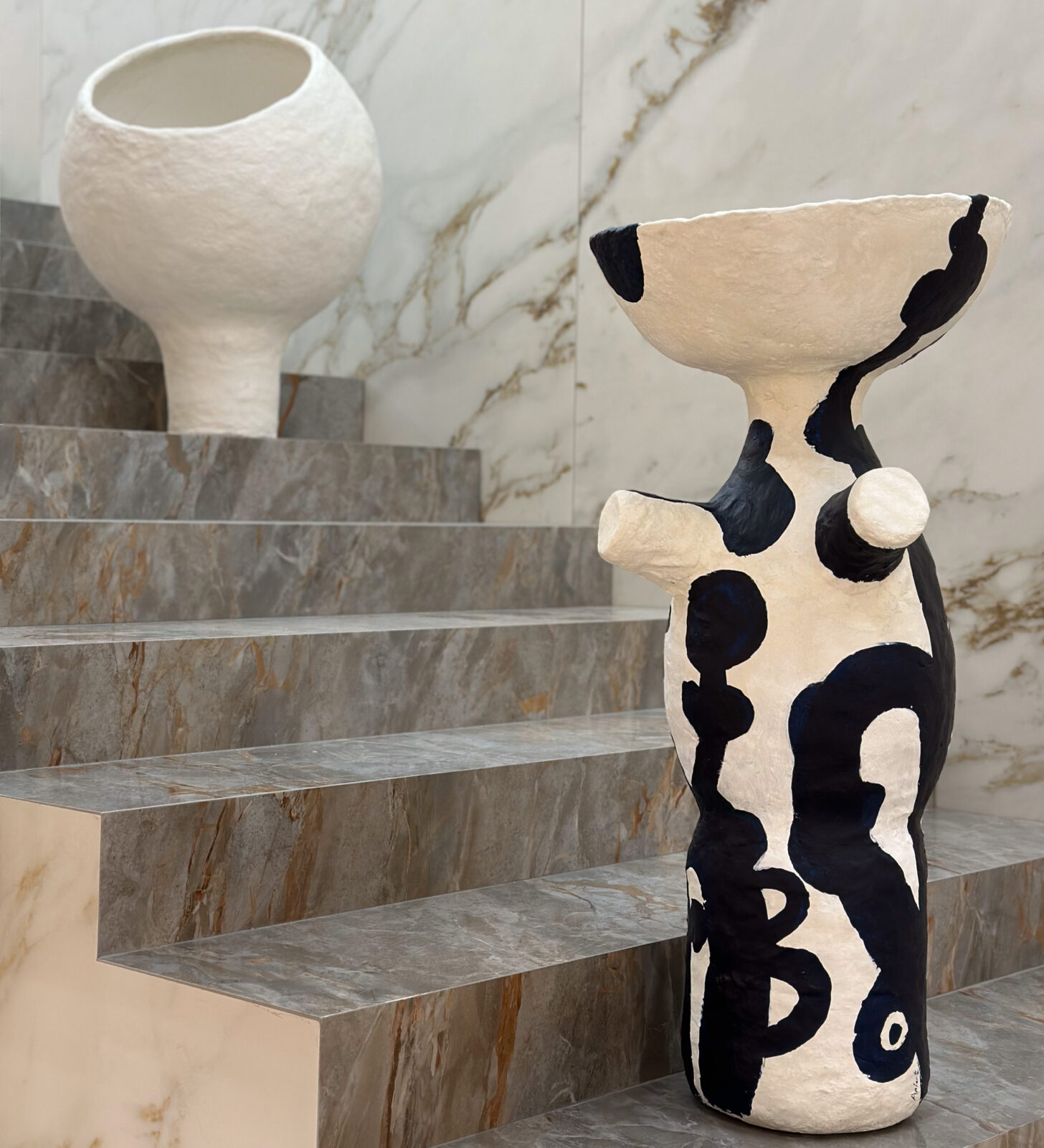 We incorporated sculptures from talented artists Fran Aniorte and Beril Nur Denli as part of our collaboration. Additionally, thoughtfully chosen accessories helped create a welcoming, lived-in atmosphere. The inclusion of live and dried plants added a natural touch, while iconic light fixtures tied the entire look together. This combination resulted in a serene environment that perfectly complemented Kale’s high-quality ceramics.